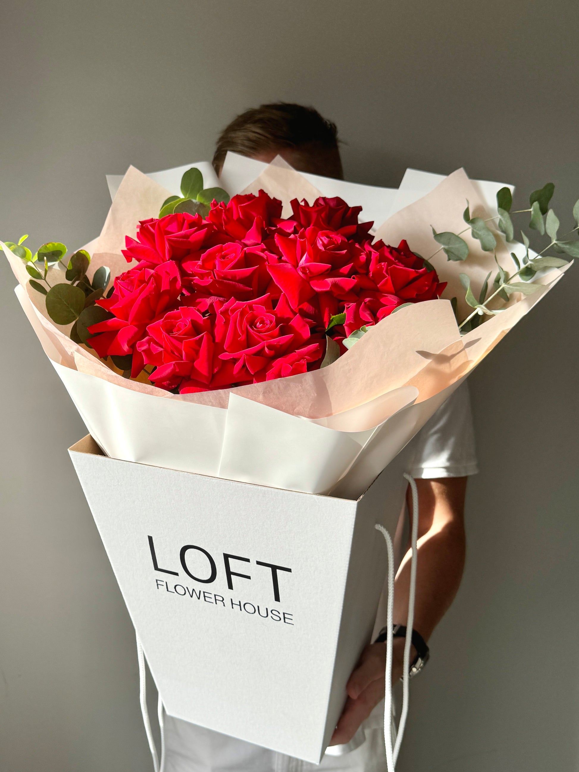 Abordamos cada pedido de forma individual. No solo confeccionamos un ramo elegante, sino que también adjuntamos una postal con tus deseos e instrucciones para el cuidado de las flores. Además, colocamos el ramo en una caja de color aguamarina y una bolsa de marca para un transporte seguro.