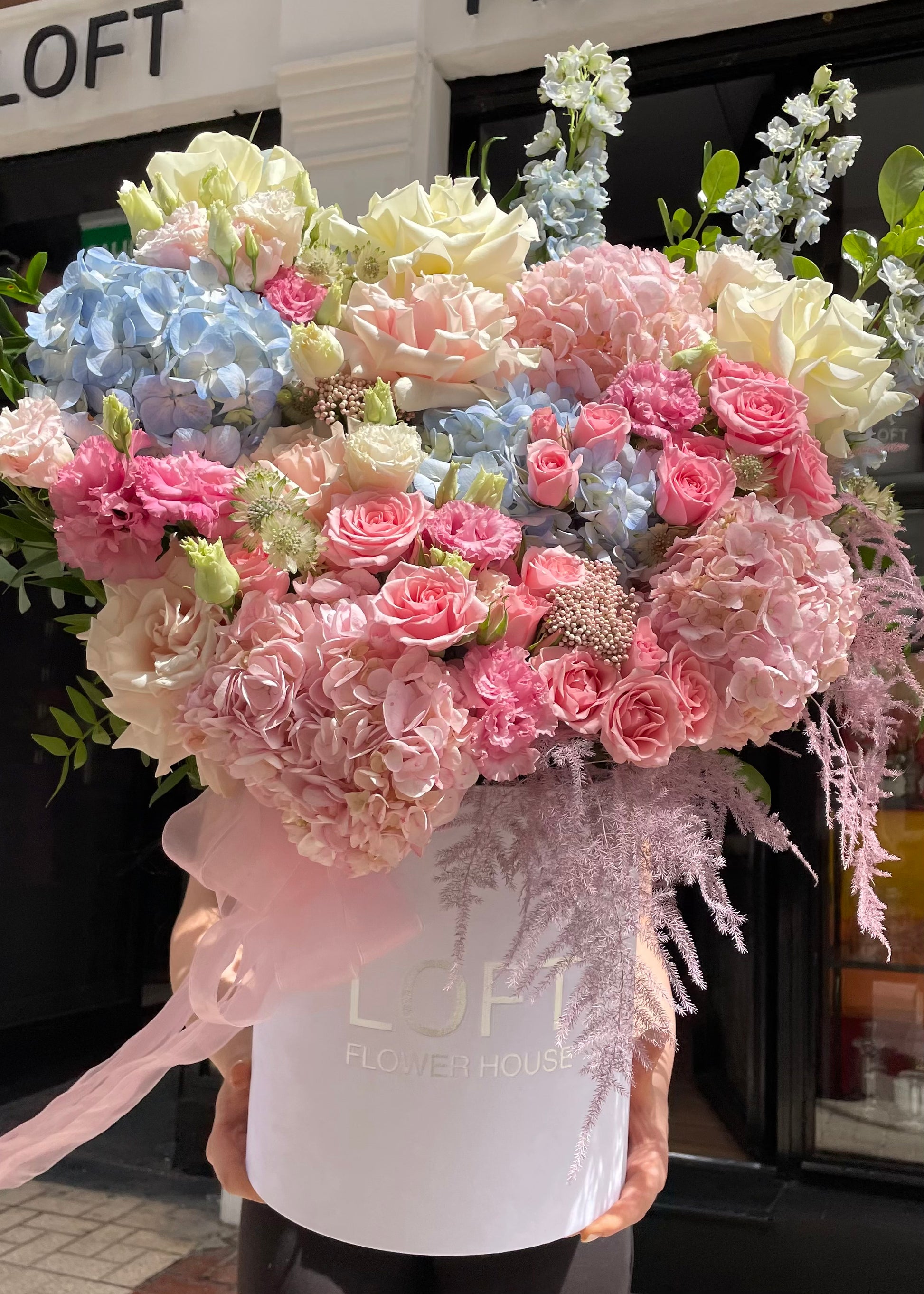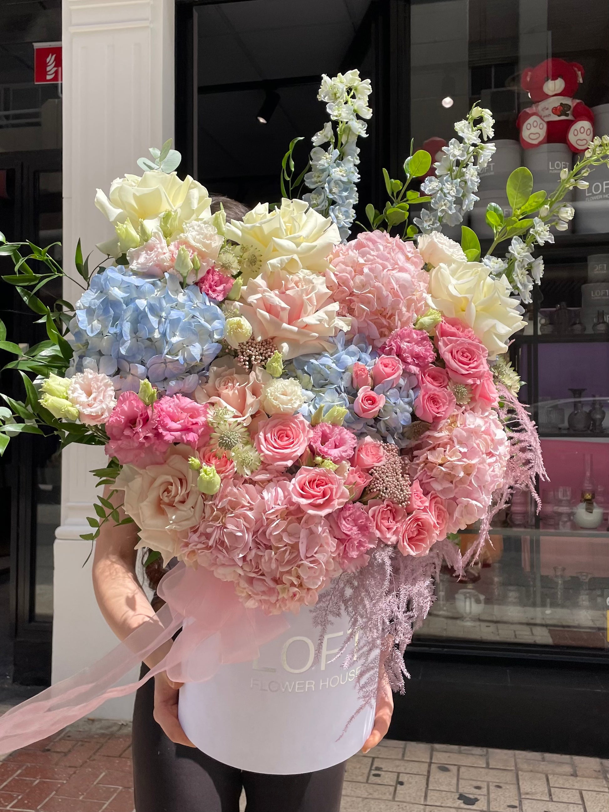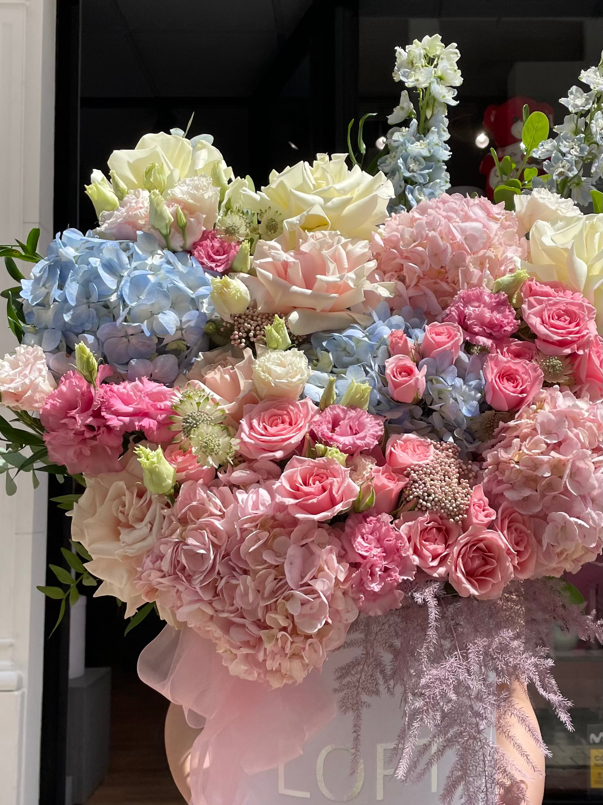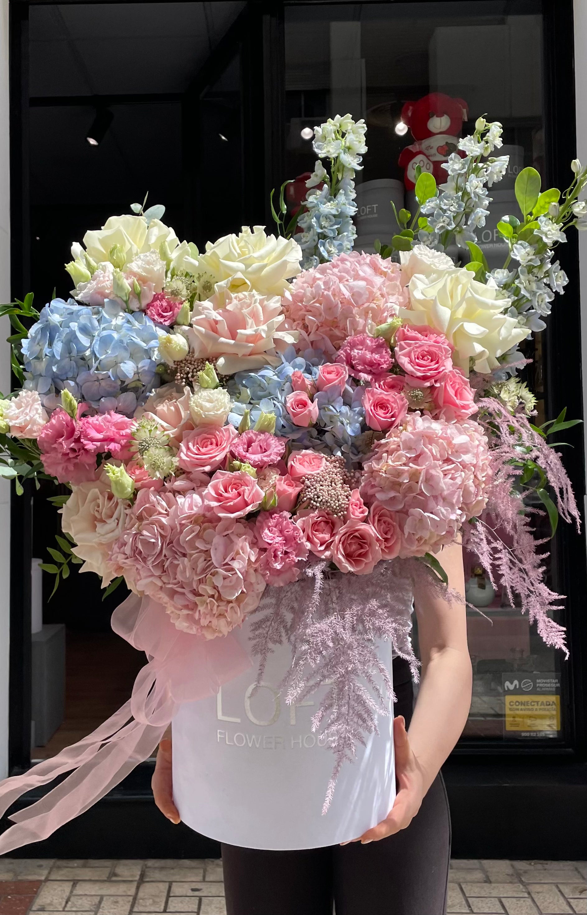 Abordamos cada pedido de forma individual. No solo confeccionamos un ramo elegante, sino que también adjuntamos una postal con tus deseos e instrucciones para el cuidado de las flores. Además, colocamos el ramo en una caja de color aguamarina y una bolsa de marca para un transporte seguro.