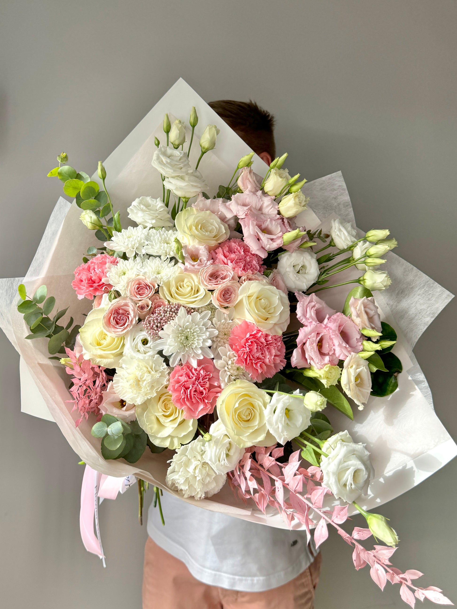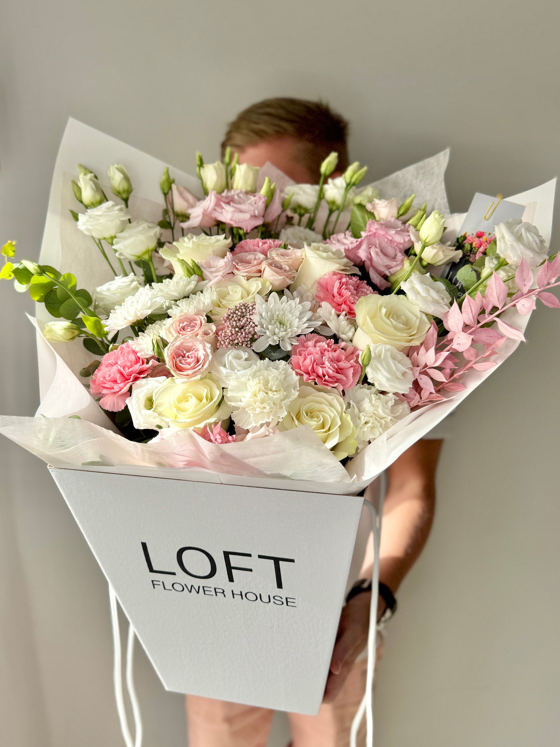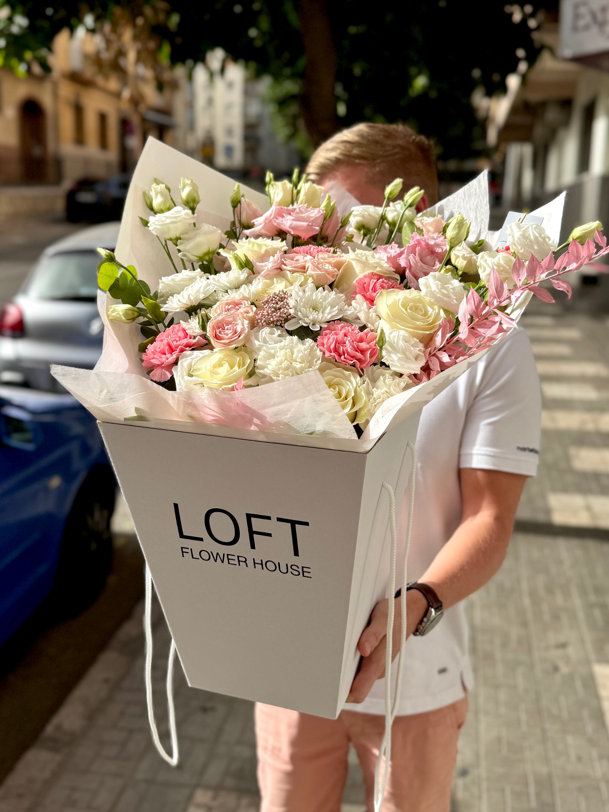 Abordamos cada pedido de forma individual. No solo confeccionamos un ramo elegante, sino que también adjuntamos una postal con tus deseos e instrucciones para el cuidado de las flores. Además, colocamos el ramo en una caja de color aguamarina y una bolsa de marca para un transporte seguro.