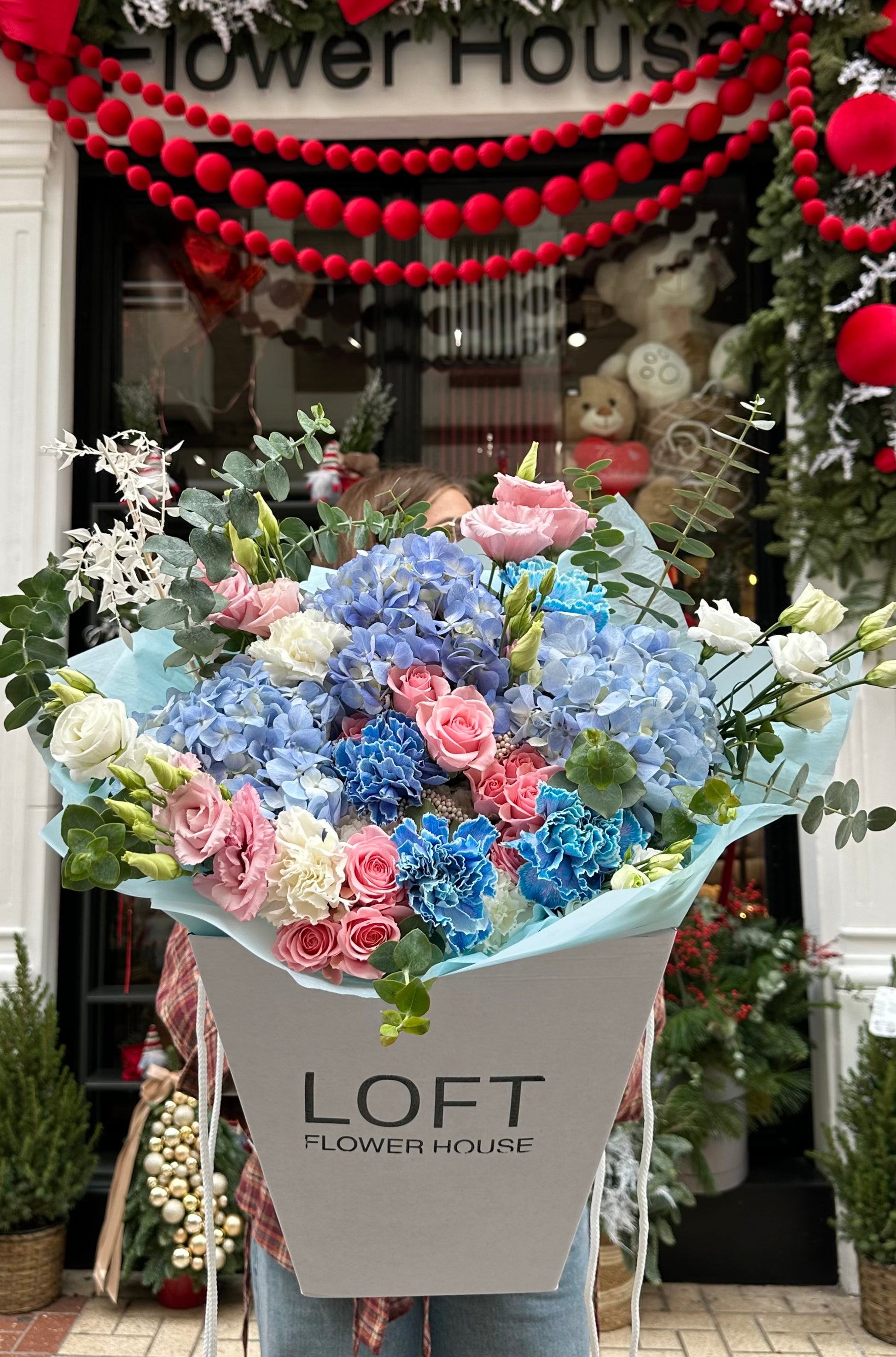 An elegant fusion of blue and blush-pink blooms - hydrangeas, roses, and lisianthus, coming together in a perfectly balanced composition that feels graceful, romantic, and timelessly chic.