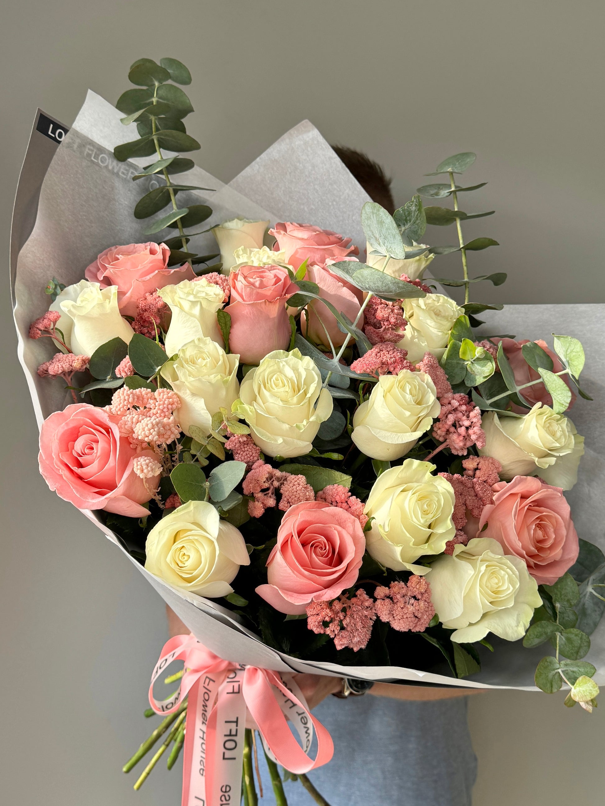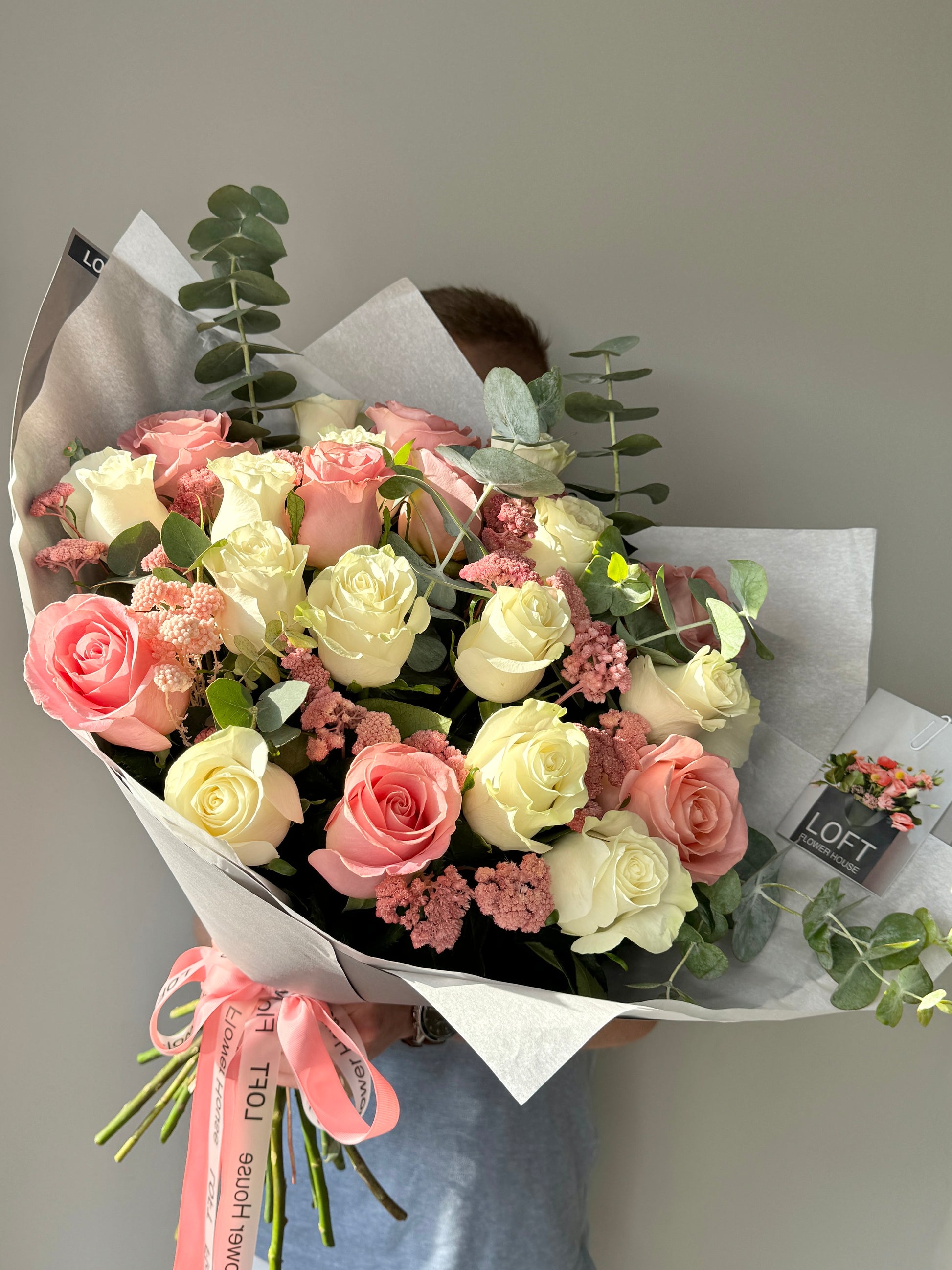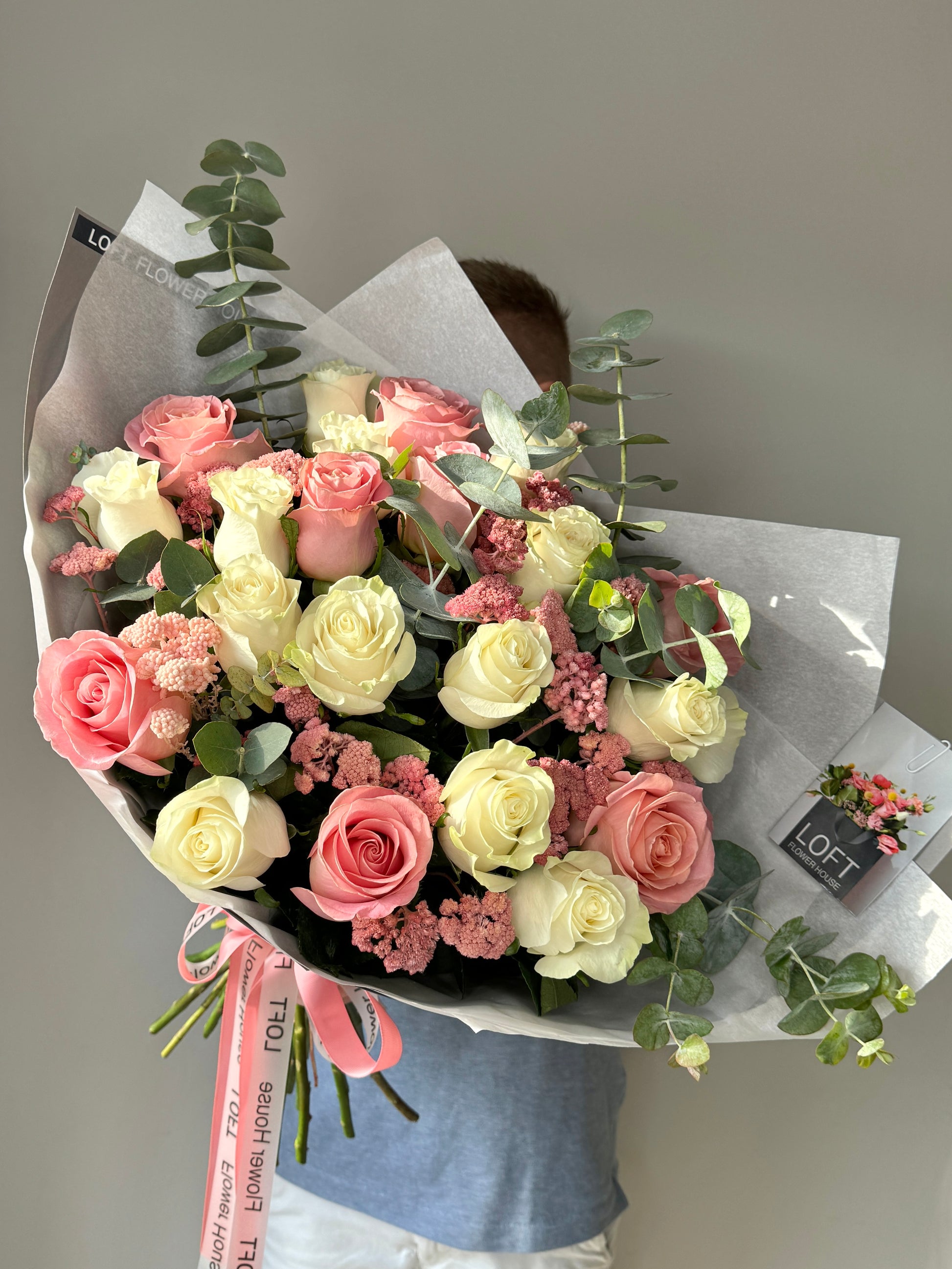 We approach each order individually. We will not only make a stylish bouquet, but also attach a postcard with your wishes, as well as flower care instructions. We also put the bouquet in an aqua box and branded bag for safe transportation.