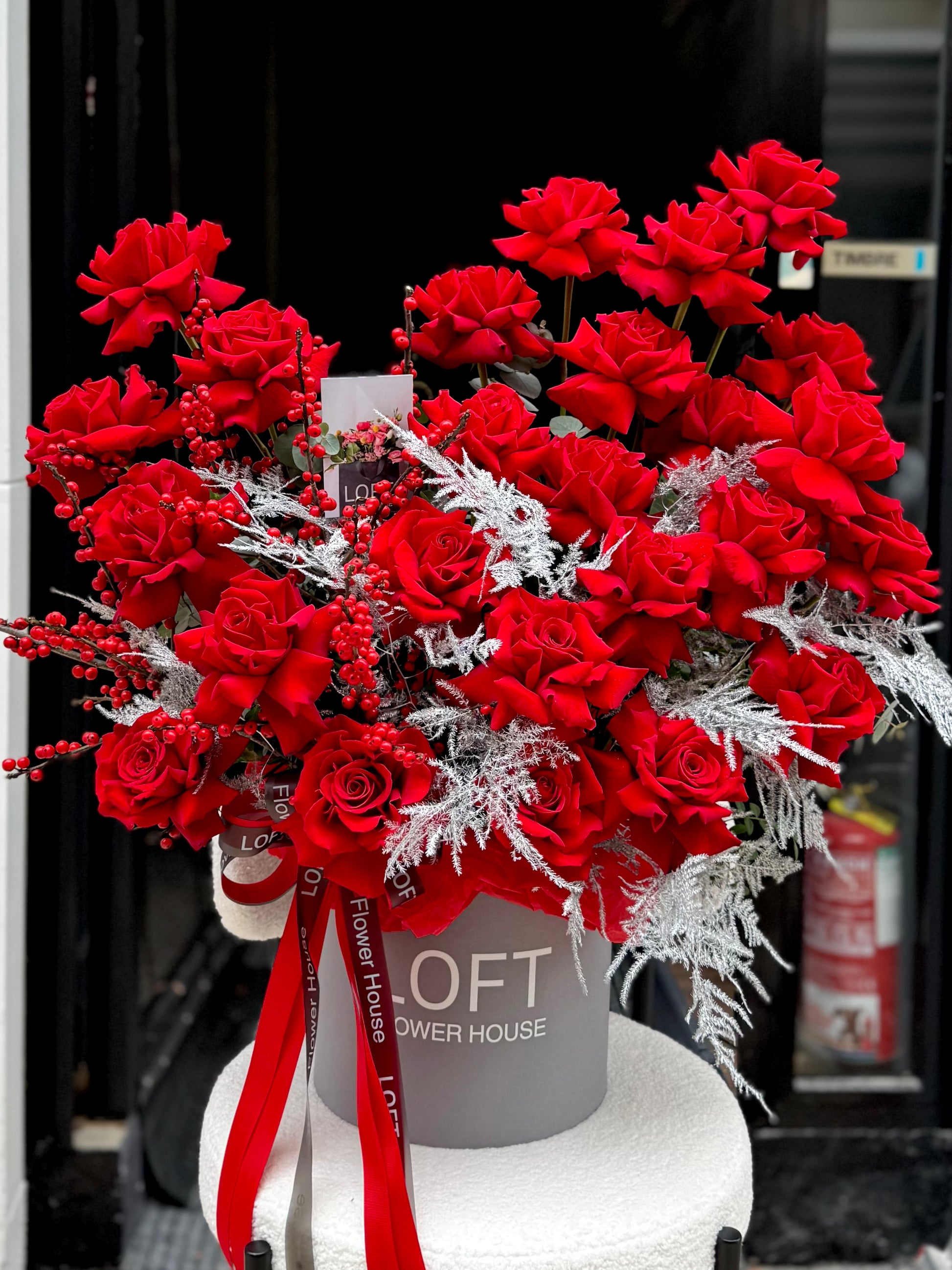 A luxurious arrangement of velvety red French roses accented with festive winter berries and subtle silver details. Rich, passionate, and timeless, this elegant arrangement is designed for unforgettable Christmas gifting and winter celebrations.