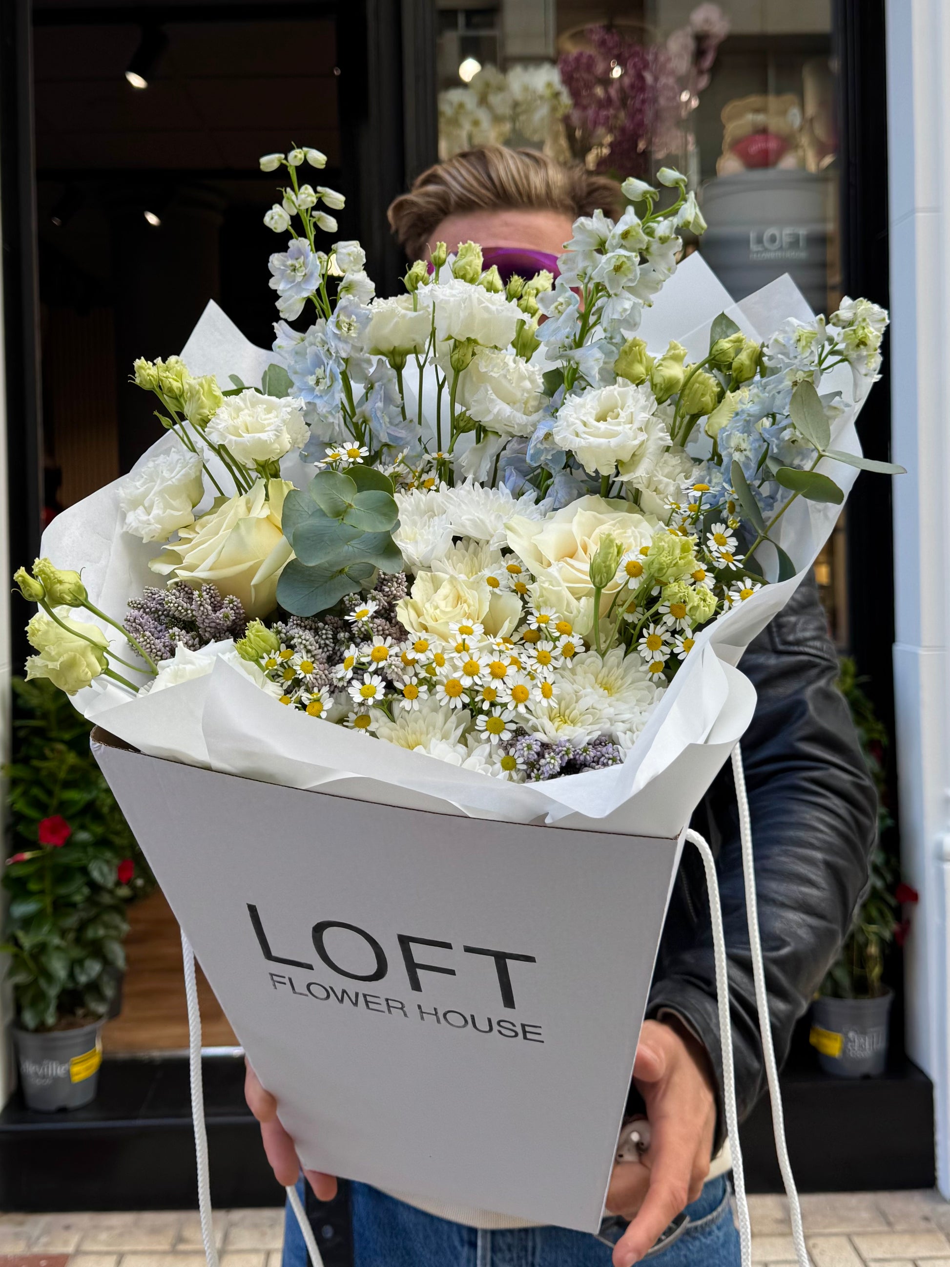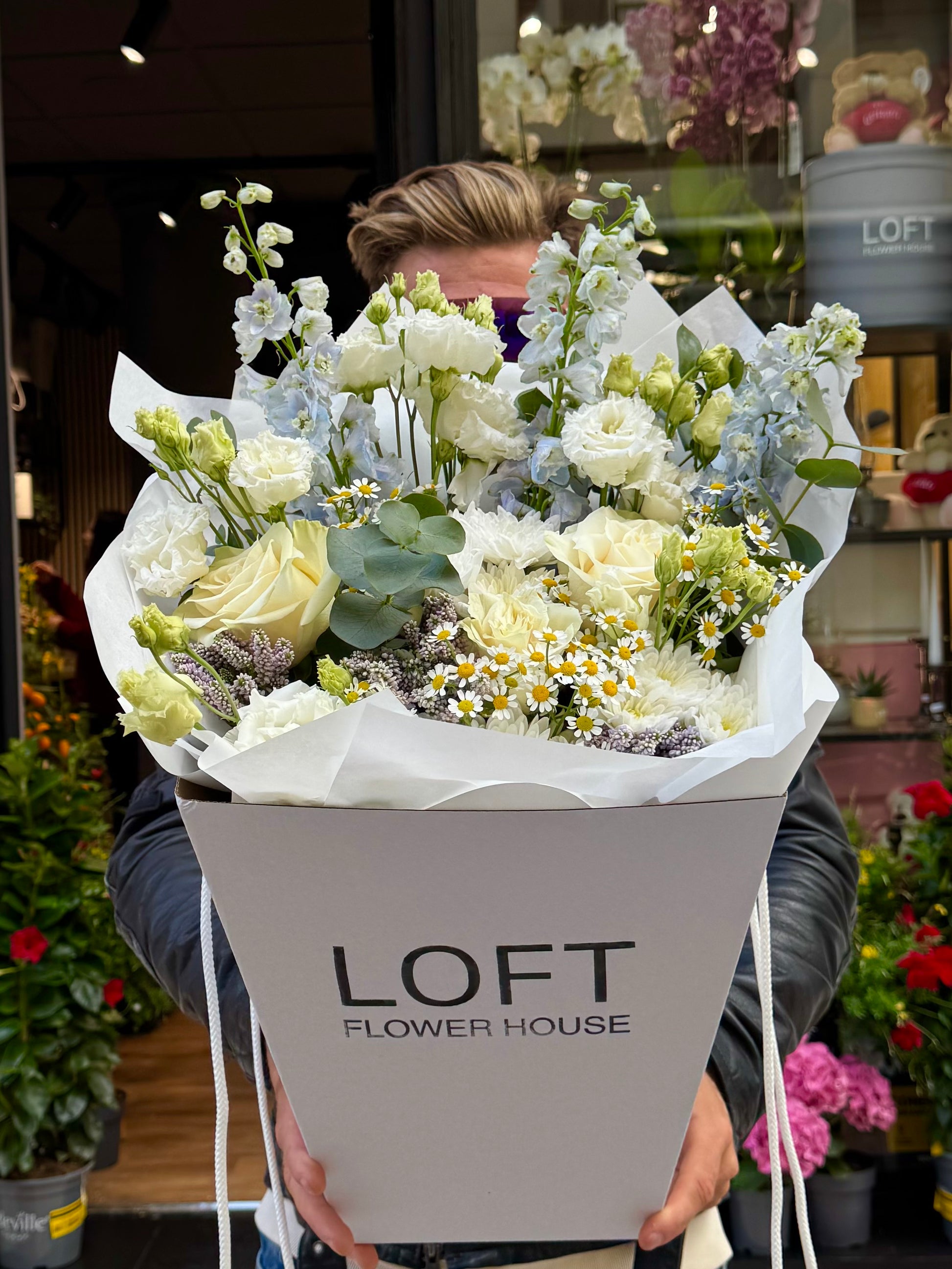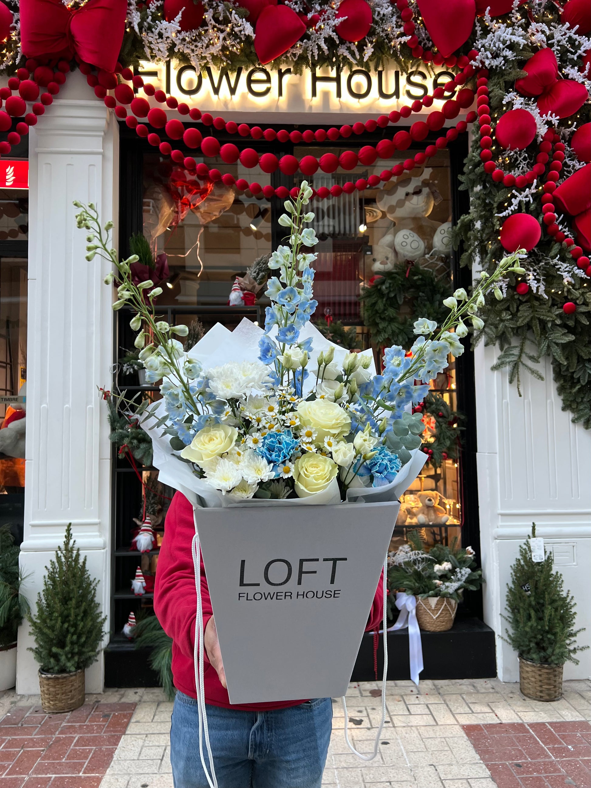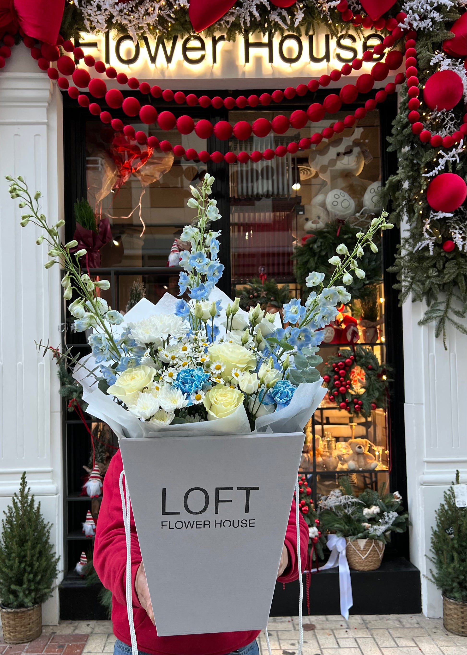 We approach each order individually. We will not only make a stylish bouquet, but also attach a postcard with your wishes, as well as flower care instructions. We also put the bouquet in an aqua box and branded bag for safe transportation.