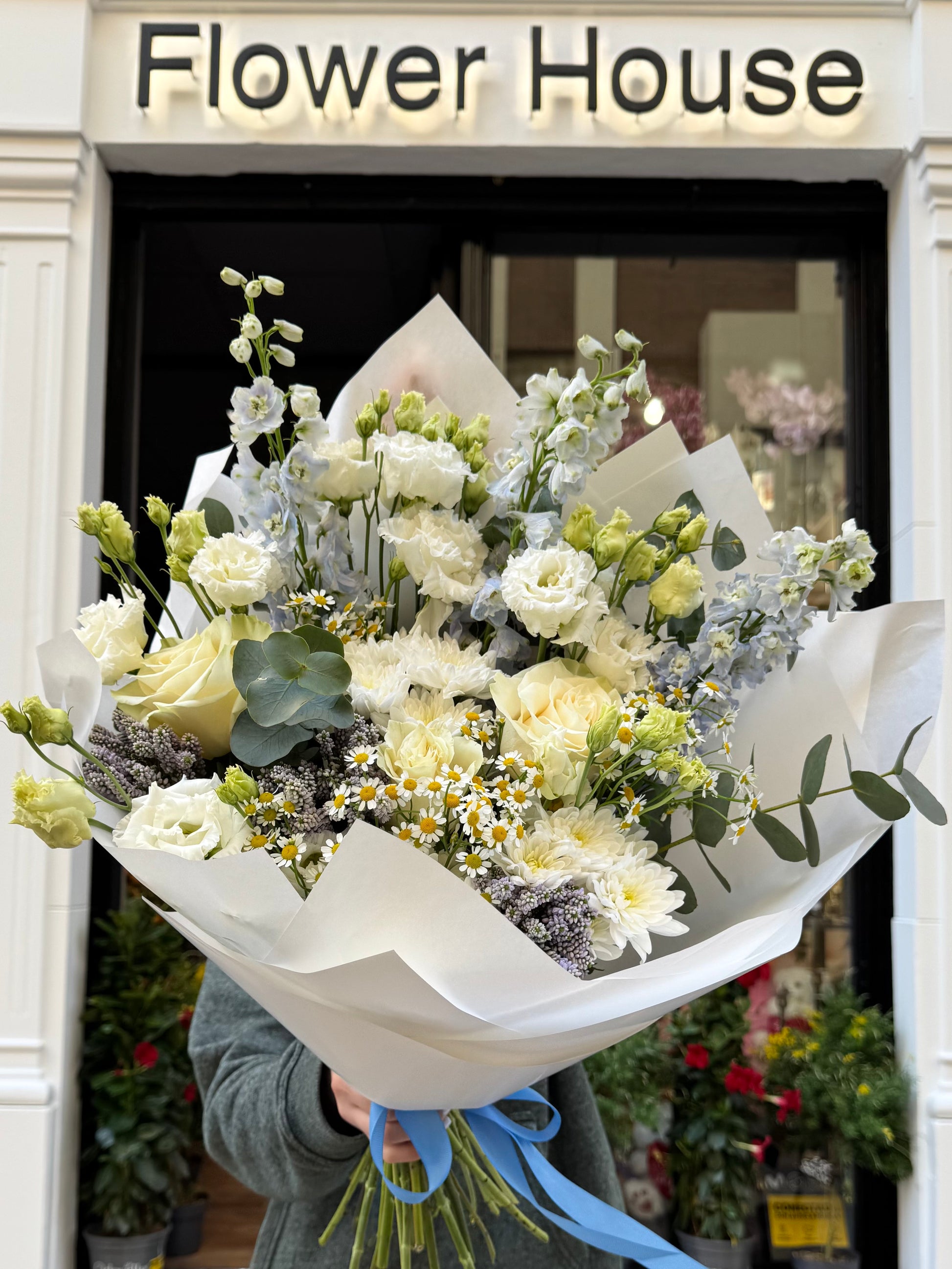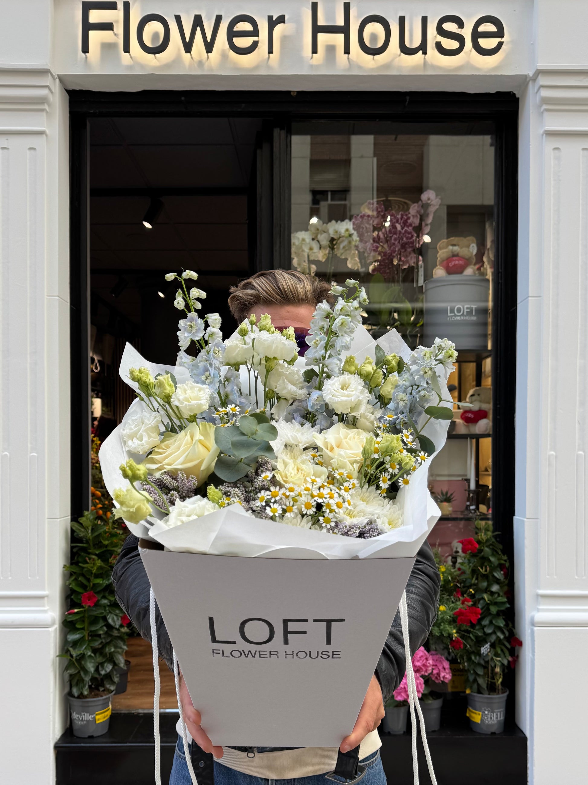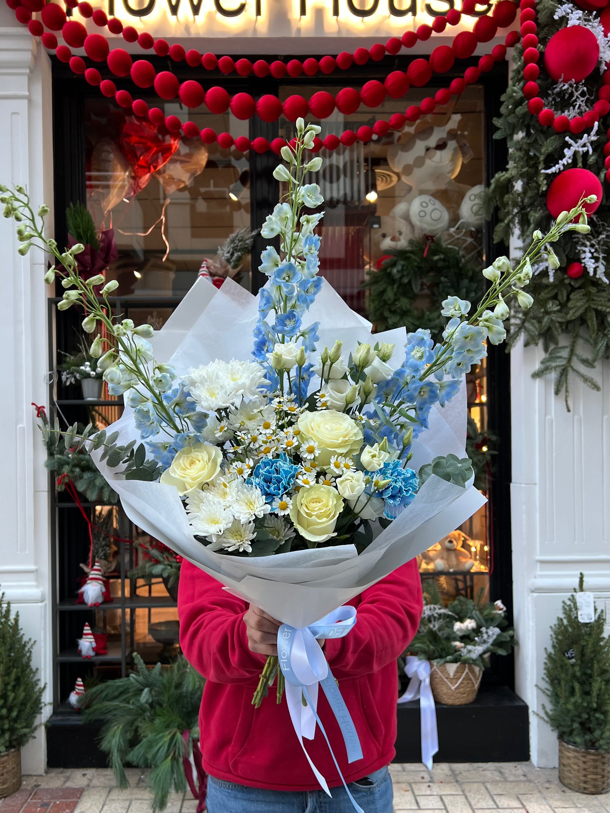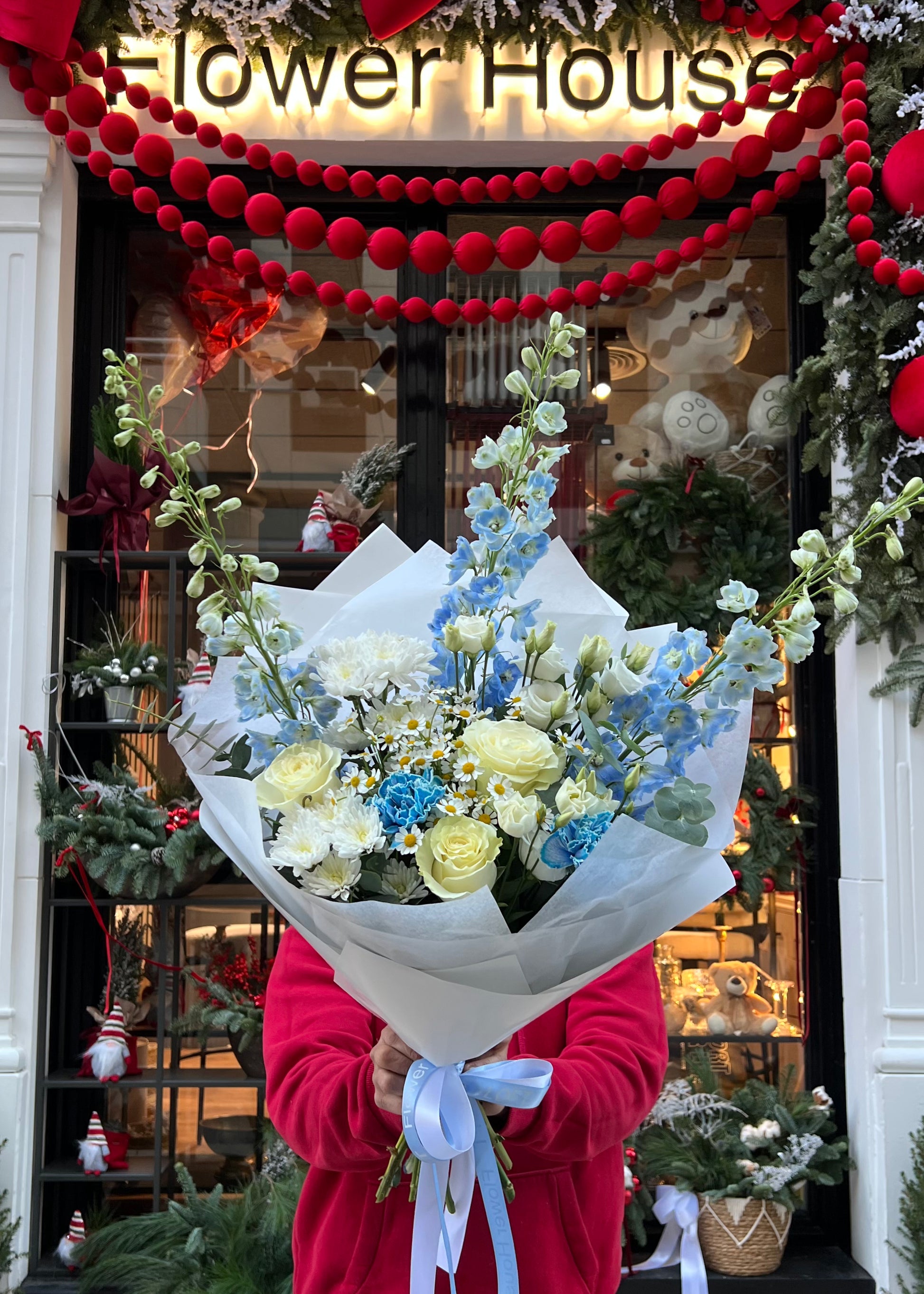 We approach each order individually. We will not only make a stylish bouquet, but also attach a postcard with your wishes, as well as flower care instructions. We also put the bouquet in an aqua box and branded bag for safe transportation.