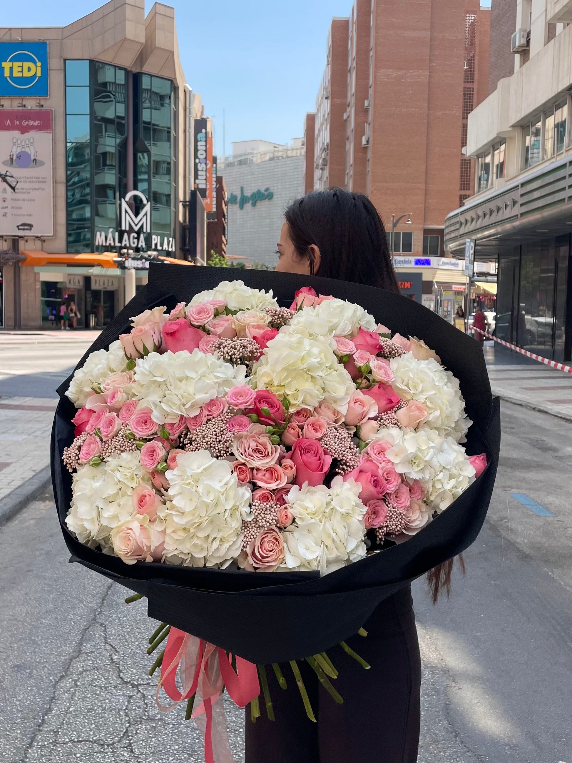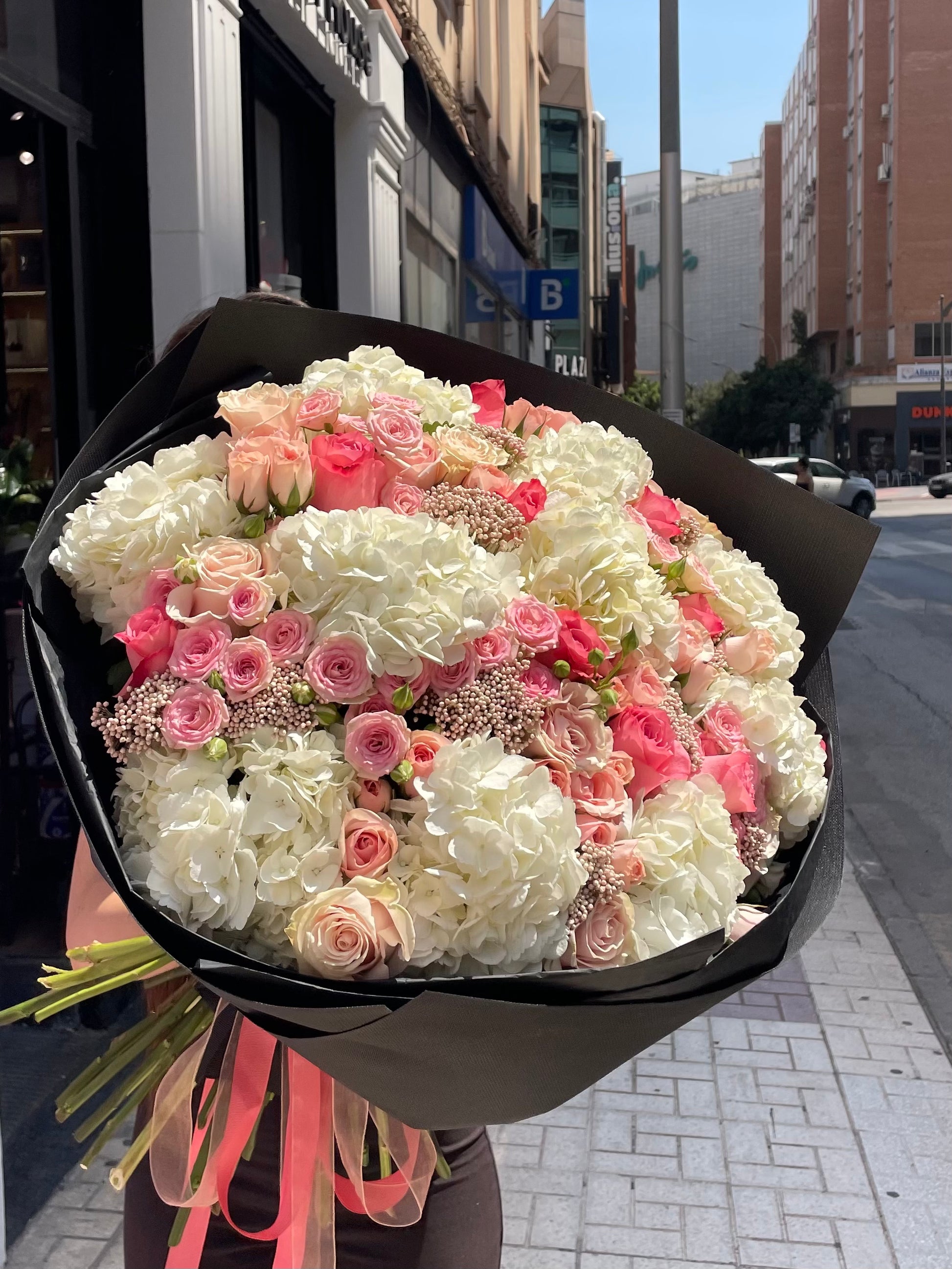 Rosy Dream - a soft, romantic bouquet in beautiful shades of pink, balanced with white hydrangeas. This arrangement brings together lush pink roses, delicate spray roses, and touches of seasonal pink blooms to create a full, airy, and feminine composition.