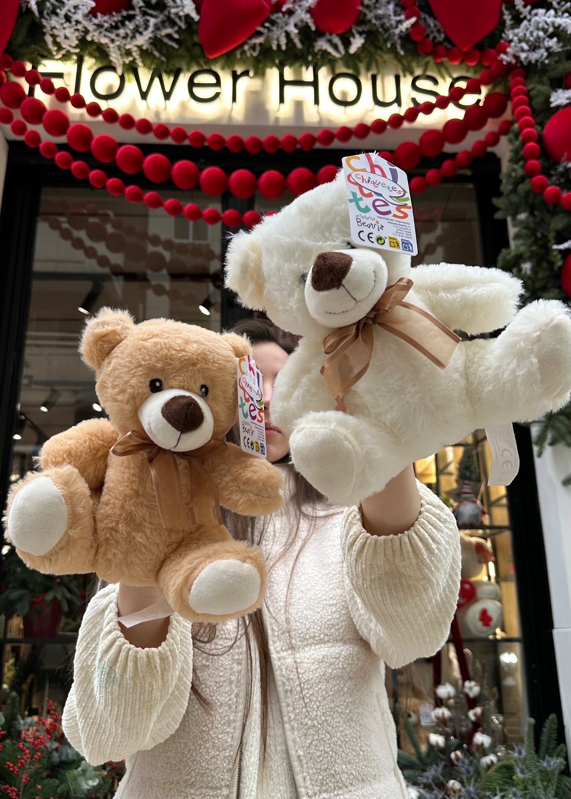 Small, fluffy teddy bears in soft white and brown tones. Made with good-quality materials, they feel gentle, cozy, and thoughtfully crafted - a lovely addition to a gift and easy to love.
