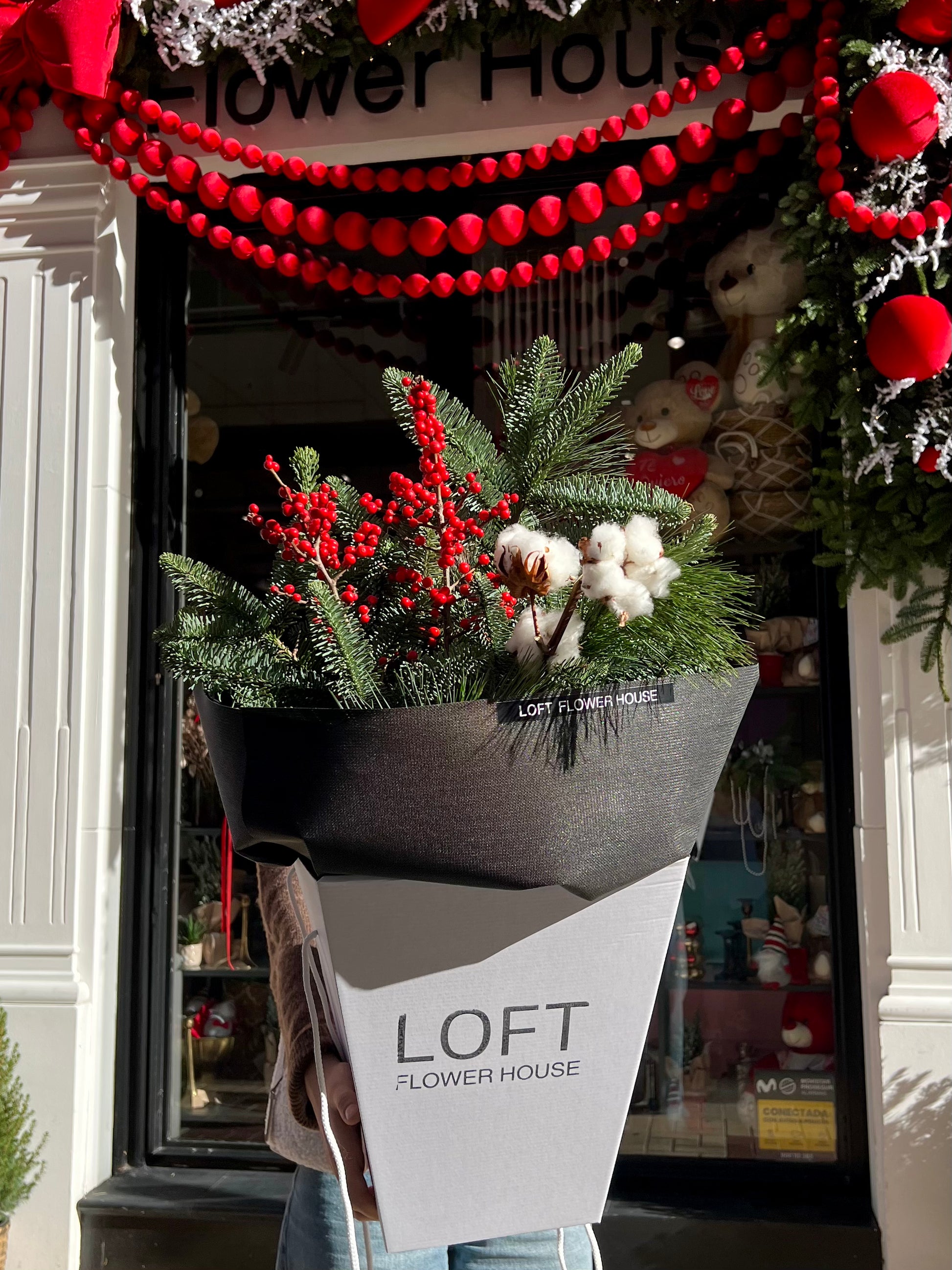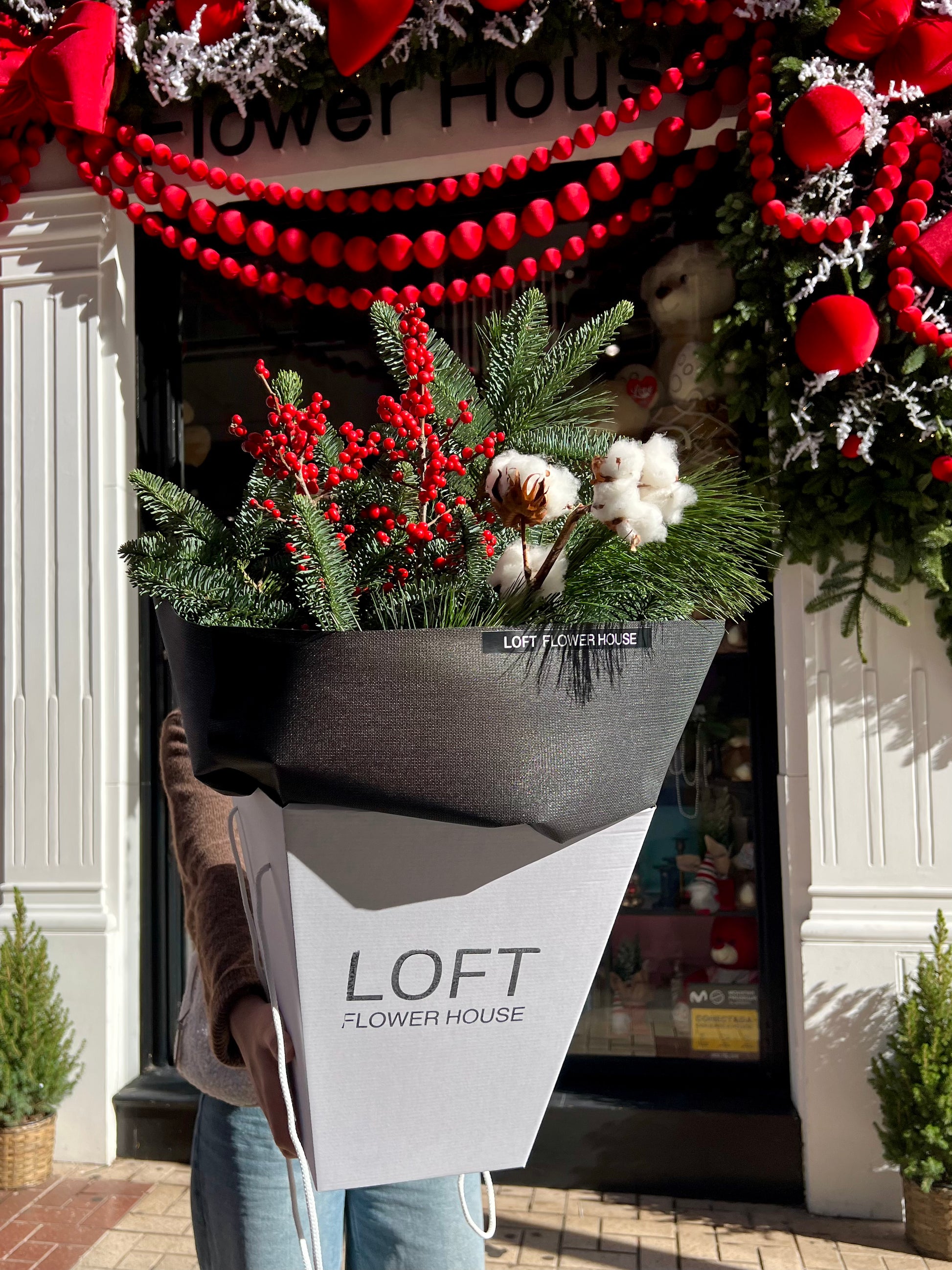 A festive collection of handcrafted winter bouquets featuring seasonal textures, berries, evergreens, and soft cotton accents — each design created to bring warmth, beauty, and Christmas spirit into any space.